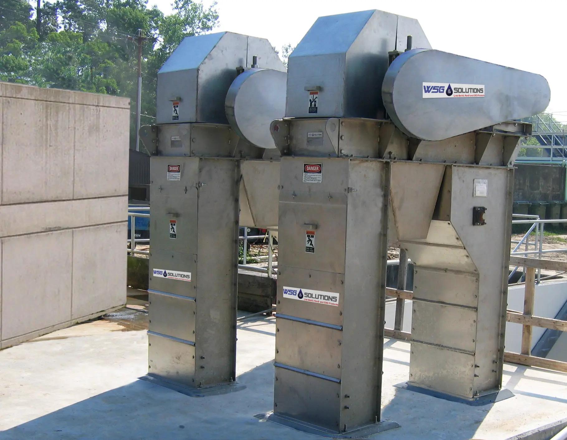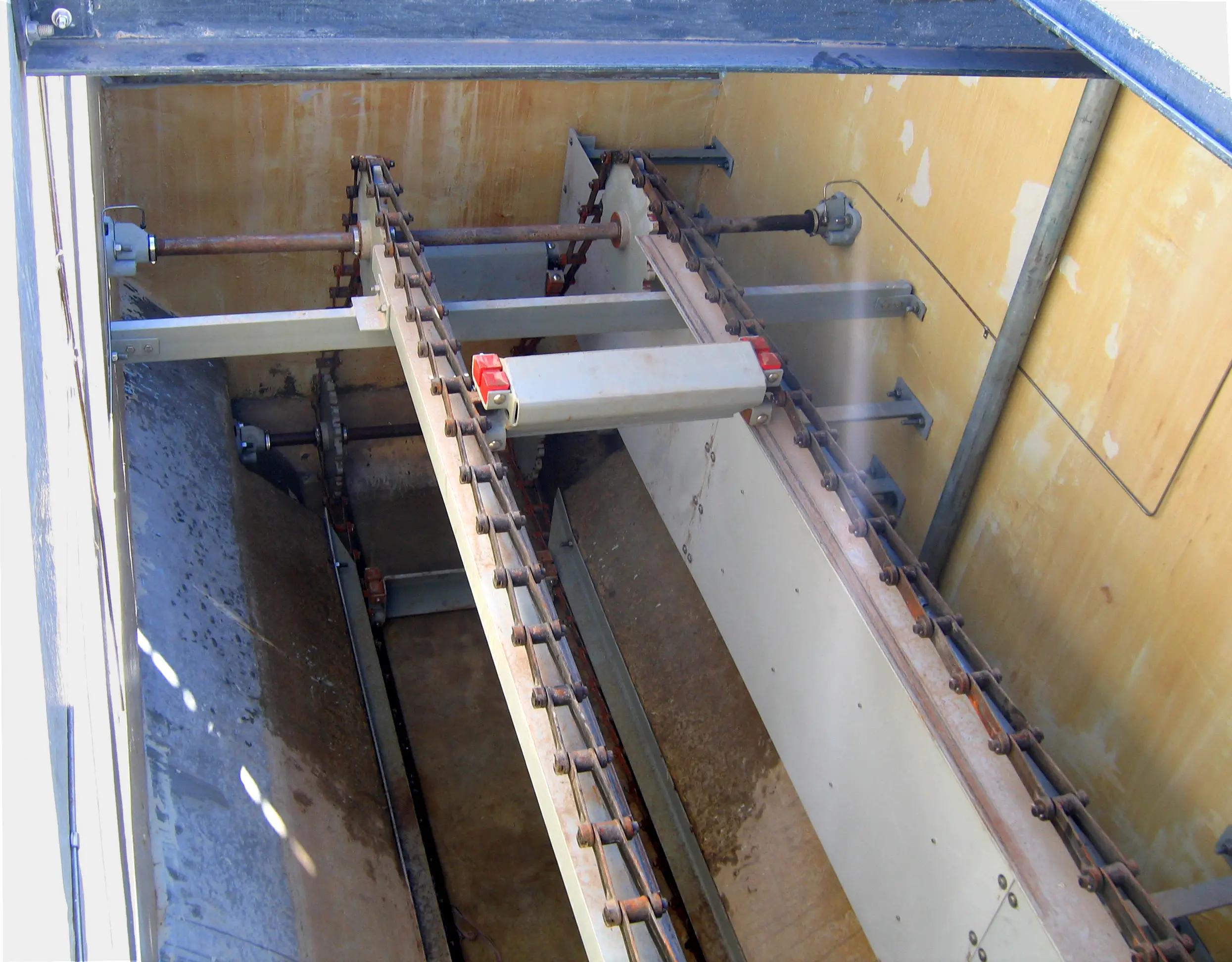 The Rex® Chain & Bucket Grit Collector can be used in shallow or deep grit chambers with flows up to 40 MGD. The high-capacity V-type buckets have end and bottom drains and are mounted on two strands of chain. The chain and bucket conveyor scrapes the grit toward the influent end of the chamber and elevates the grit to a discharge point where it is deposited into a SW Grit Washer, screw conveyor, belt conveyor, or discharge receptacle.