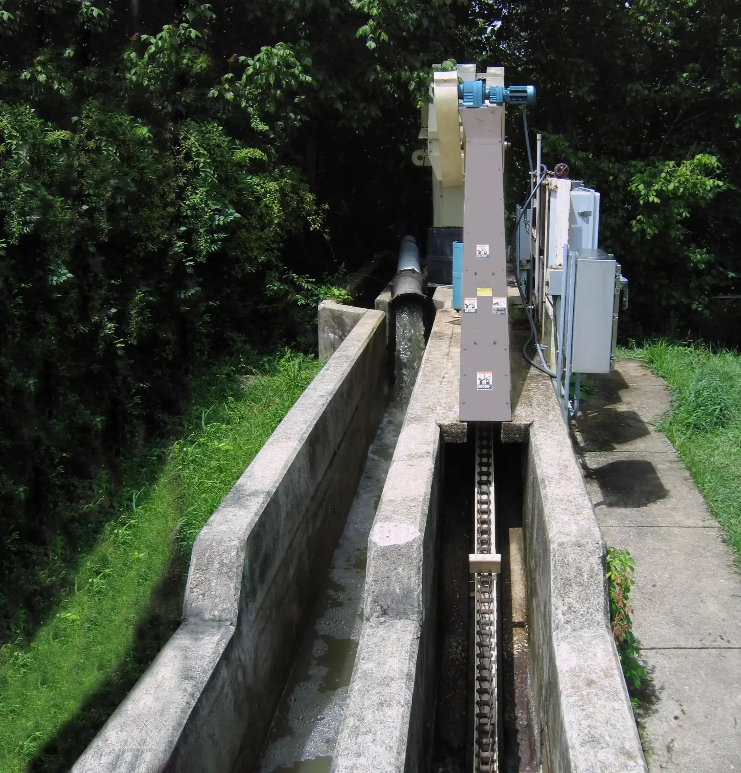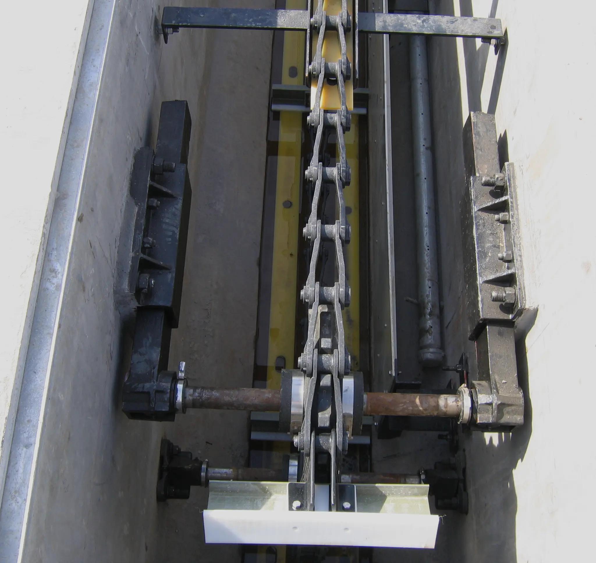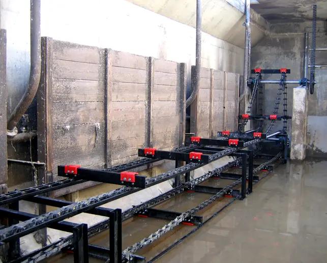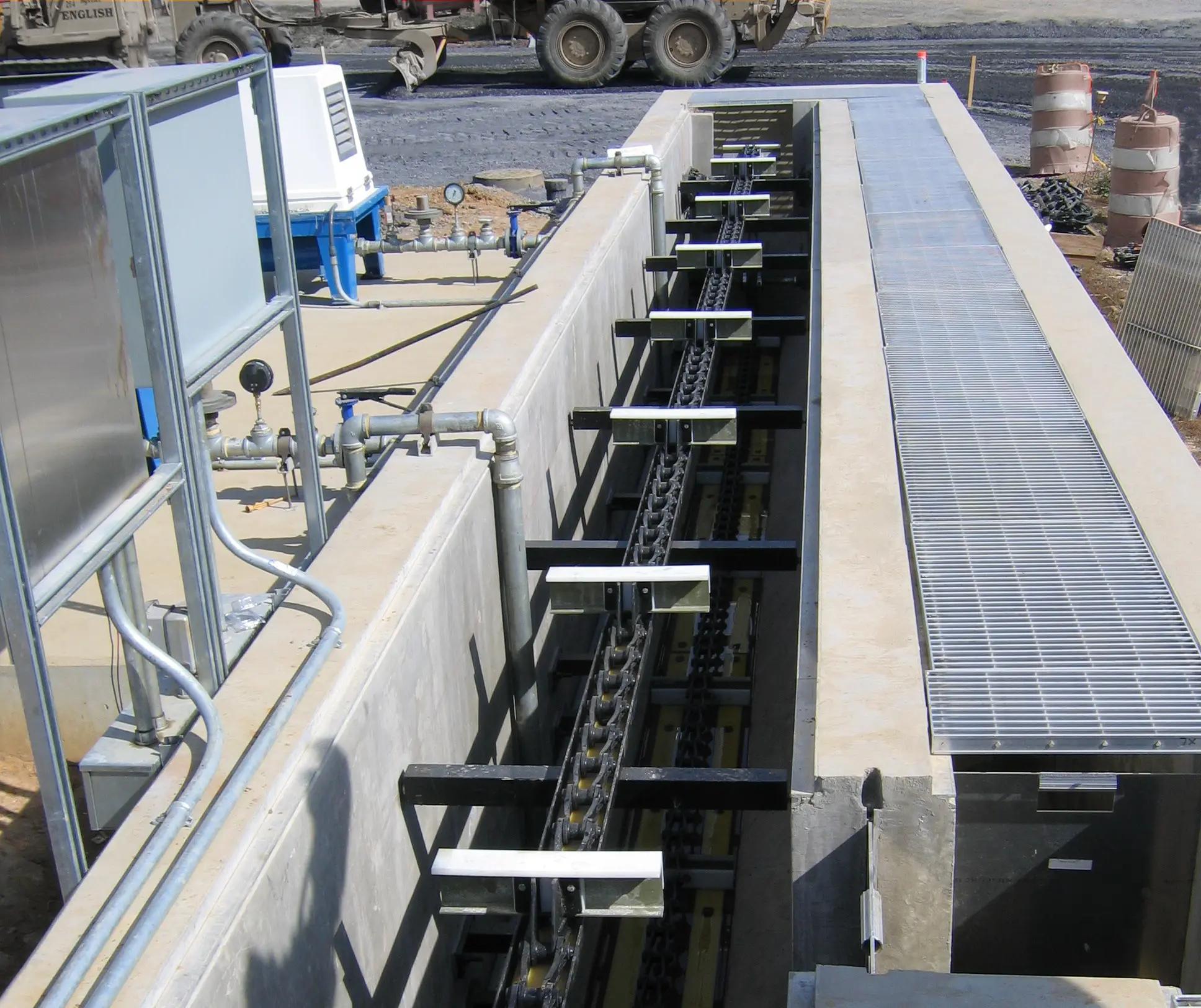 The REX® Chain & Scraper Grit Collector can be used in treatment plants with flows up to 5 MGD and shallow depths up to 5′-0″. A suitably clean grit is obtainable by proper velocity control in the grit chamber and by grit recirculation if desired. Grit is removed by scrapers attached to a chain which moves across the chamber bottom and then up an incline where the grit is then deposited into a receptacle.